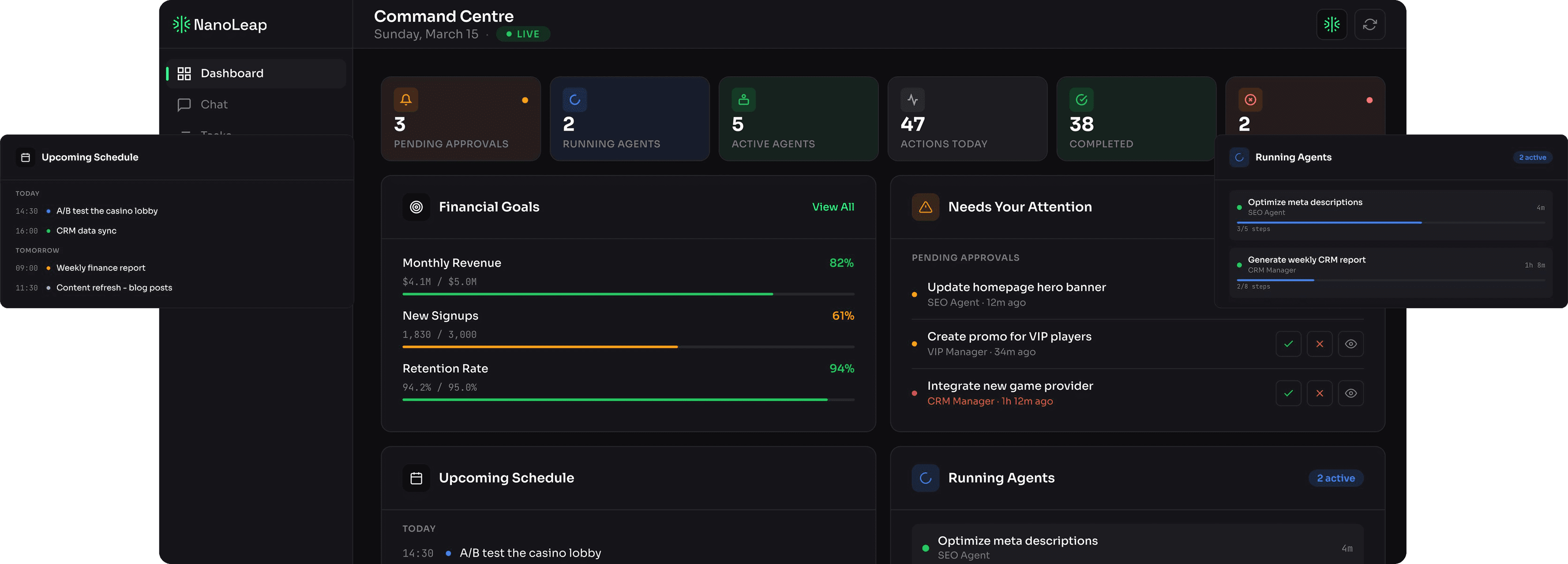 NanoLeap is an AI-powered iGaming platform that manages on-site marketing and operations across your website, operating 24/7 either autonomously or via supervision.