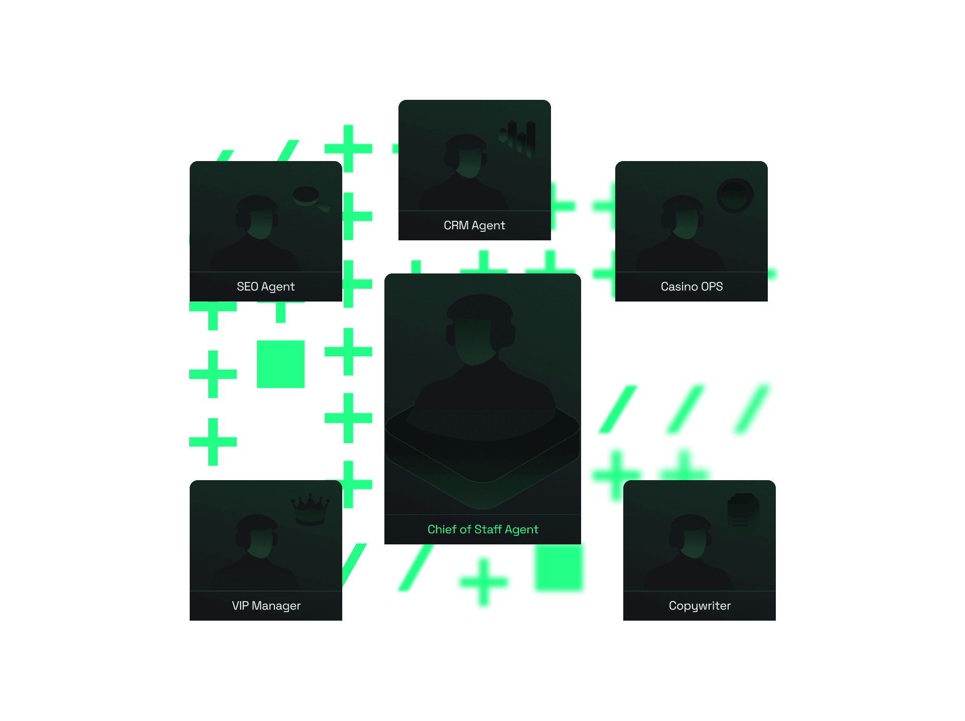 Not generic chatbots. Specialized agents for SEO, CRM, casino ops, VIP management, copywriting, and more — each trained on iGaming operations. Plus a Chief of Staff that orchestrates them all.